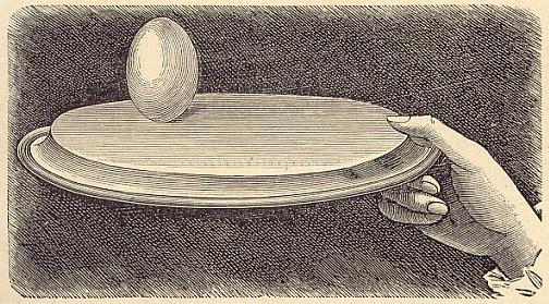 Experiencia.- Colloca-se um ovo cosido no fundo bem polido d'um prato, ao qual se vae dando um movemento circular horisontal, cada vez mais rapido. O ovo, que a principio estava deitado no meio do prato, sendo impulsionado por este movimento, vae-se levantando, começa a girar sobre o seu eixo e acaba por tomar a posiçao vertical, como se fosse um piao.- Se houver difficultade, por falta de destreza, em fazer a experiencia, como fica indicada, poe-se o prato sobre uma mesa, com um bocado para fora, de modo que possa ser agarrado promptamente; depois, com o dedo pollegar da mao esquerda e o indicador da direita, collocados parallelamente, e ficando o ovo entre elles, imprime-se-lhe um vigoroso movimento de rotaçao. O ovo começa a girar, em seguida pega-se no proto e continua-se esse