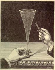 muy notable cuando se procura hacer vibrar la aguja bajo una lámpara que dé mucha luz; en este caso la persistencia de las impresiones en la retina permite ver en un mismo instante la aguja vibrante toda entera en sus posiciones sucesivas, ofreciendo a la vista la imagen fugitiva de un vaso cónico muy alargado, como las copas del champagne (fig. 96).
