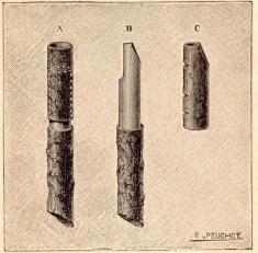 Se toma un tallo verde de lila o de sauce, y se corta la corteza con una navaja. Se golpea la corteza mojada en la boca con ayuda del mango de la navaja que se ha empleado, dando los golpes sobre la rodilla. Hecho esto se procede a descortezar una sola pieza por un movimiento rotatorio, impreso con delicadeza con la mano derecha, mientras la izquierda sujeta la parte inferior del tallo. De esta manera puede hacerse el silbato ordinario, obtenido como en el cañón de la llave (fig. 97), o el verdadero silbato, cortando el tallo y la corteza como indican B y C.