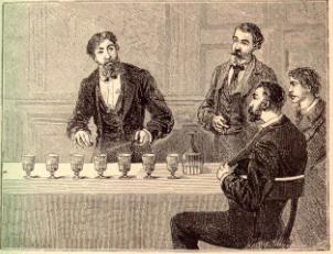 una mesa; los sonidos que producen son diferentes, según el tamaño de las tablitas. El mismo efecto puede obtenerse mucho mejor con unas copas más o menos llenas de agua: golpeando en éstas con una varita producen un sonido capaz de modificarse, aumentando o disminuyendo la cantidad de agua que contengan, y si el operador está dotado de un oído músico, puede obtener por tanteo una verdadera escala con siete de estas copas, cada una de las cuales dará su nota (figura 98), y hasta podrá conseguir por este procedimiento tocar un trozo o pieza musical.