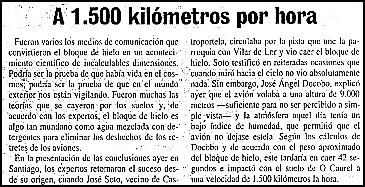 Si el bloque recorrió 9000 metros en su caída, el tiempo de vuelo (tv) será 9000 = ½ 9,8 tv2 tv = 43 s y la velocidad de impacto (vi) vi = 9,8 tv = 9,8·43 = 4,2·102 m/s = 1,5 103 km/h Los resultados obtenidos son los que aparecen en el periódico pero ¿son correctas las aproximaciones. ¿Se comete mucho error al suponer que la aceleración de caída es constante? No. A 9000 metros sobre la superficie de la Tierra la aceleración de caída sigue siendo 9,8 m/s2. ¿Se comete mucho error al no tener en cuenta la presencia del aire? Si. Cuando un objeto se mueve en el aire, las moléculas de éste chocan contra el objeto dando lugar a una fuerza de resistencia que se opone al movimiento. Esta resistencia depende de varios factores : forma y orientación del objeto en relación a la dirección del movimiento, densidad del aire y velocidad relativa. La fuerza de rozamiento que experimenta el objeto al caer, aumenta al aumentar la velocidad y como consecuencia llega un momento en el que se iguala el peso del objeto y la fuerza de rozamiento. A partir de aquí la velocidad de caída se mantiene constante, denominándose velocidad límite. Para el bloque de hielo de la noticia la velocidad límite podría llegar a ser del orden de 70 m/s que equivale aproximadamente a 250 km/h, muy diferente de la velocidad obtenida sin tener en cuenta la presencia del aire. Más información sobre la velocidad límite en :